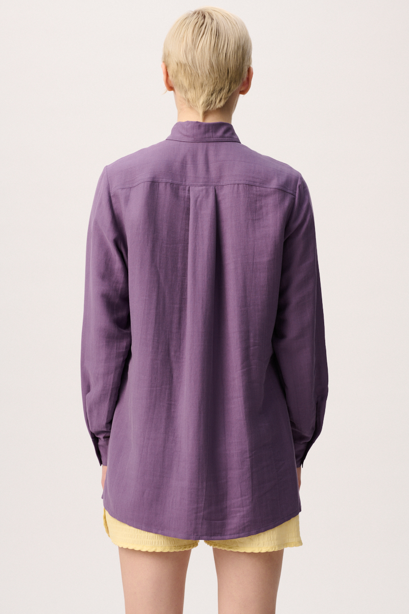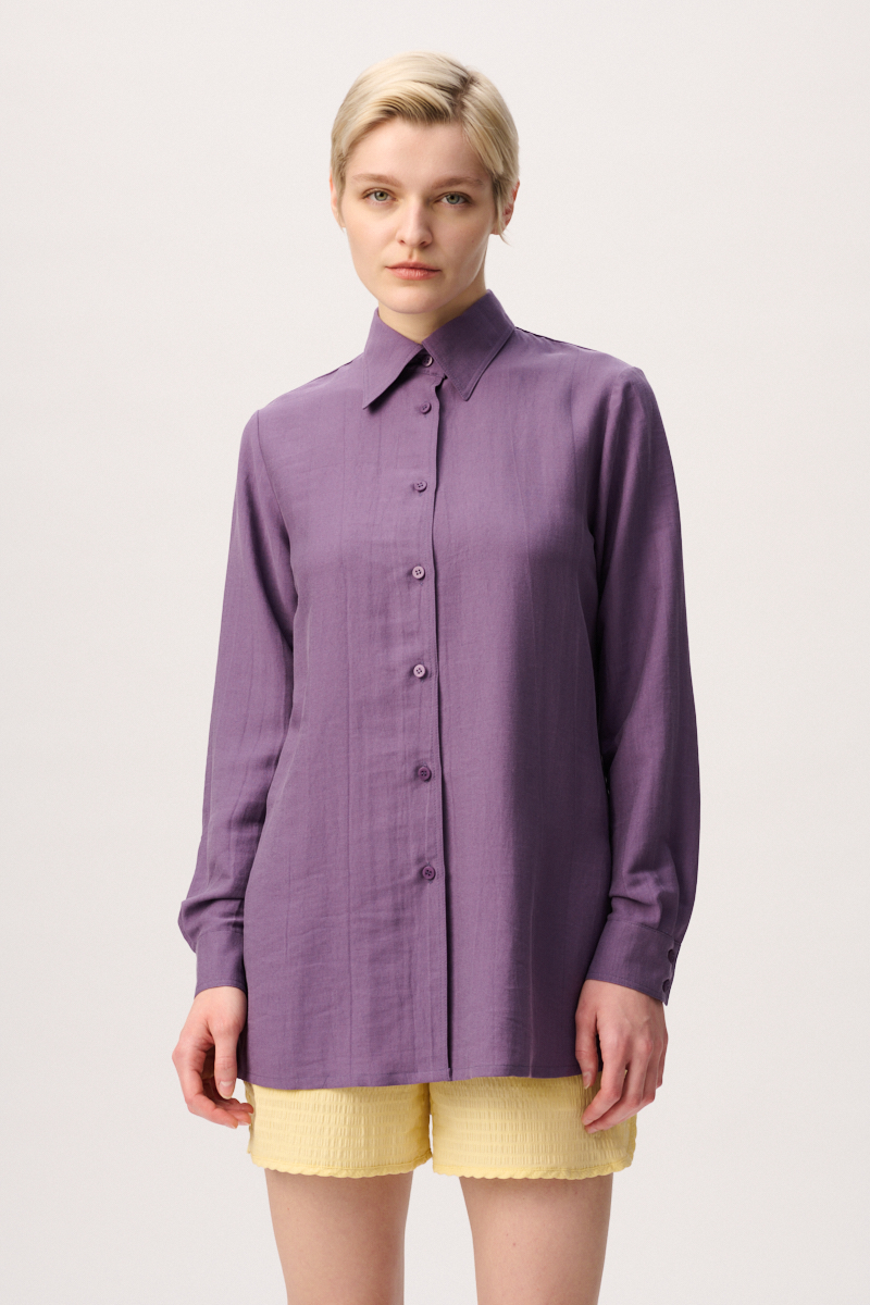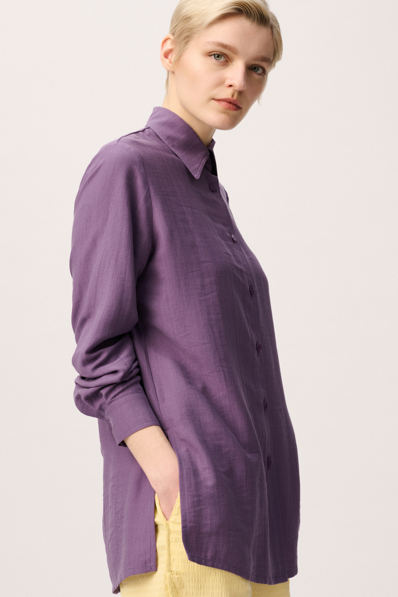 Leichte klassische Bluse aus Viskose mit seitlichen Schlitzen, sichtbarer Knopfleiste sowie einer Kellerfalte im Rücken. Die Raffinesse erhält die Frauenbluse durch den leicht spitz ausgeformten Kragen.
