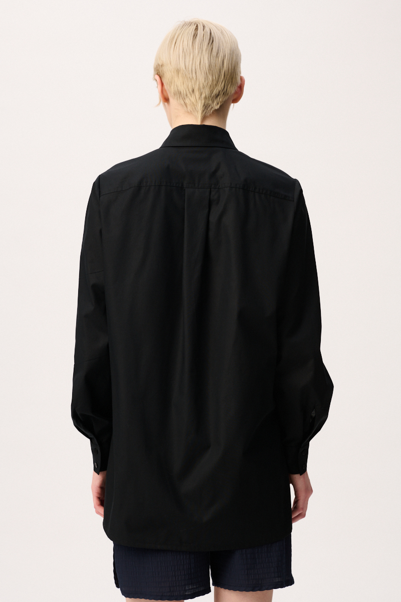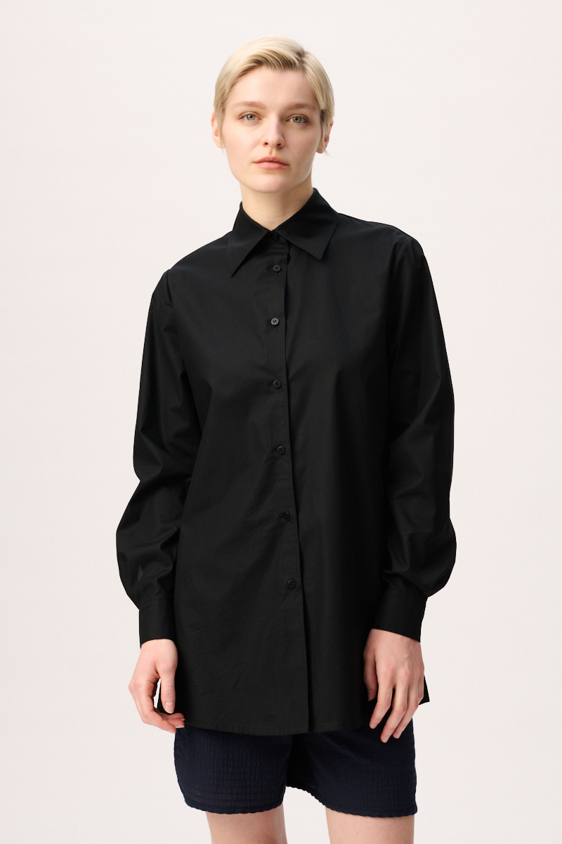 Leichte klassische Bluse aus zertifizierter Baumwolle mit seitlichen Schlitzen, sichtbarer Knopfleiste sowie einer Kellerfalte im Rücken. Die Raffinesse erhält die Frauenbluse durch den leicht spitz ausgeformten Kragen.