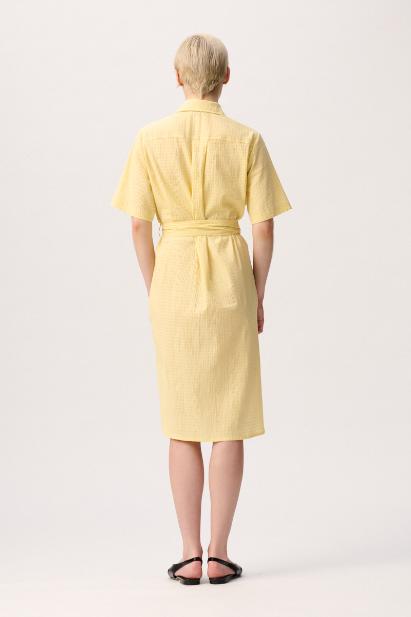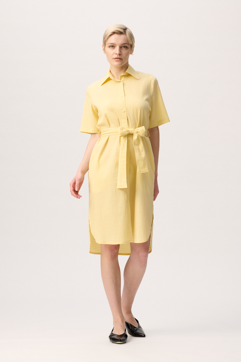 Leichtes Hemdblusenkleid aus zertifizierter Bio-Baumwolle, mit Taschen in den Seitennähten, einem Gürtel sowie seitlichen Gürtelschlaufen. Das Frauenkleid ist hinten länger als vorn und hat einen abgerundeten Abschluss mit seitlichen Schlitzen. Das Minikleid kann auch als Sommermantel getragen werden.