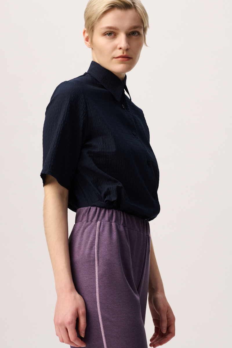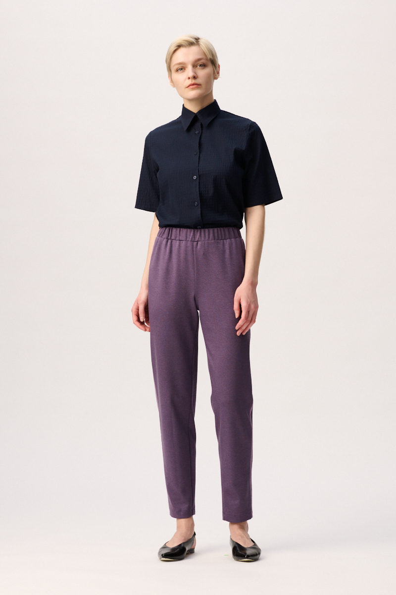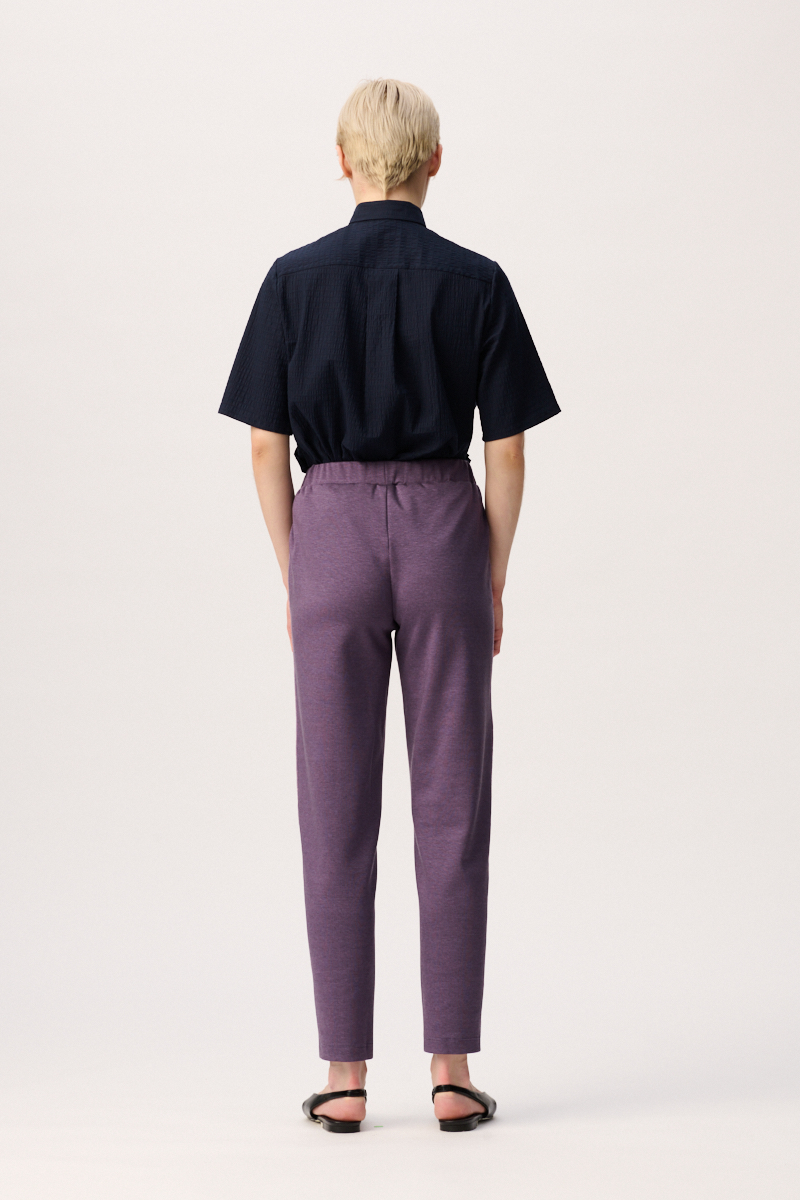 Lässige Frauenhose ohne Taschen, mit zartem Glanz und Kontrastnähten in Rosé. Die sportliche und elegante casual Hose hat einen easy going Charakter und ist dennoch perfekt für das Büro. Durch den Gummi im Hosenbund kann die Damenhose in der Position und nach Vorliebe getragen werden. Die Leibhöhe der Hose im Schnitt ist auf Taille angelegt. Wir empfehlen, diese auf der Taille zu tragen.