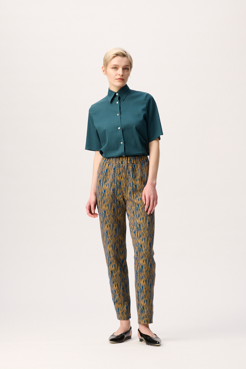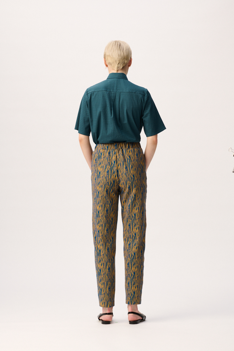 Hochwertiger Strick, Jacquard aus zertifizierter Bio-Baumwolle und Kontrastnähten in Orange. Die sportliche und elegante Frauenhose hat einen easy going Charakter und ist dennoch perfekt für das Büro. Durch den Gummi im Hosenbund kann die Damenhose in der Position und nach Vorliebe getragen werden. Die Leibhöhe der Hose im Schnitt ist auf Taille angelegt. Wir empfehlen, diese auf der Taille zu tragen.