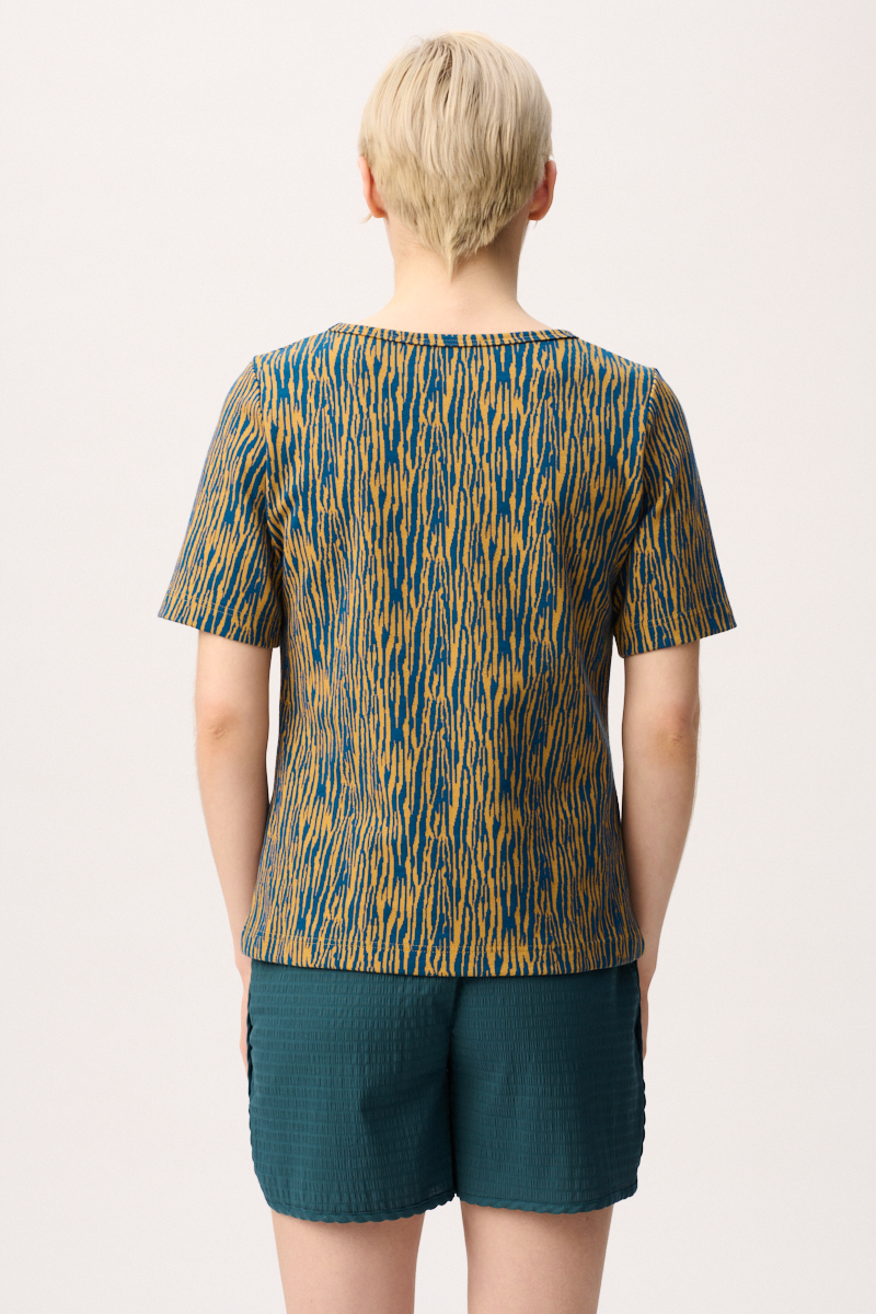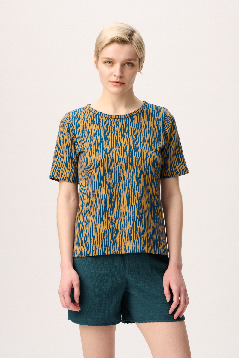 Hochwertiger Strick, Jacquard aus zertifizierter Bio-Baumwolle. Besonders schön sieht unser T-Shirt Romy Ton in Ton zu casual Hose Lotto oder in Kombination mit den unifarbenen Shorts Toni in Grün aus. Das Shirt hat eine etwas lockere Passform und sitzt nicht eng am Körper.